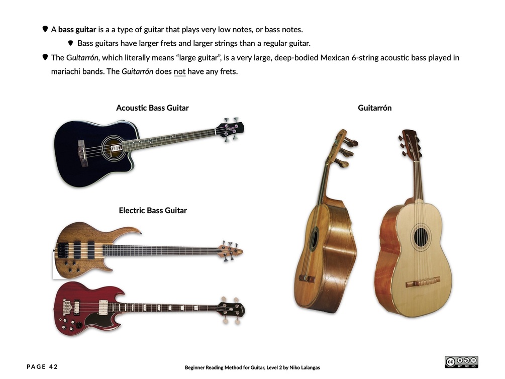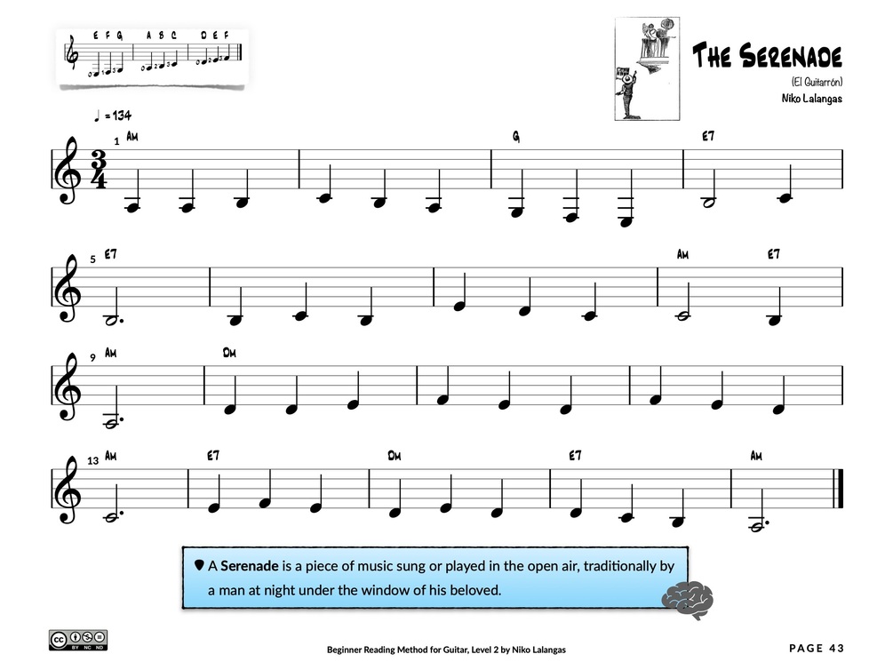 Once you’ve mastered the first three strings of the guitar in Level 1, Level 2 begins the journey through the last three strings. In addition, sharps, flats, natural signs, chords, and more are introduced expanding further on the basics of reading music notation. Duets introduce an important aspect of music: Harmony. Level 2 completes all six strings of the guitar. More complicated songs challenge the learner to memorize a total of 17 notes in the first position. PDF format compatible with Apple Books or any PDF reader.
